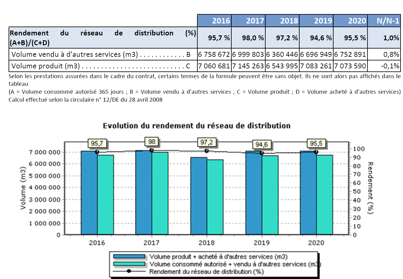 En d'autres termes, il établit la différence entre la quantité d'eau qui arrive effectivement aux communes et la quantité d'eau qui est introduit dans le réseau depuis les réservoirs. Le rendement technique du réseau représente donc le taux de fuites du réseau.